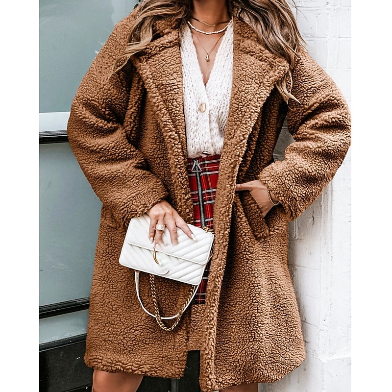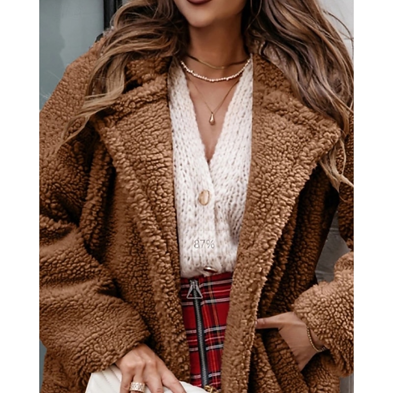 Women's Winter Coat Teddy Coat Casual Jacket Warm Comfortable Pocket Fashion Plain Outdoor Daily Wear Going out Weekend Single Breasted Regular Turndown Regular Fit Long Sleeve Outerwear Black Brown 11