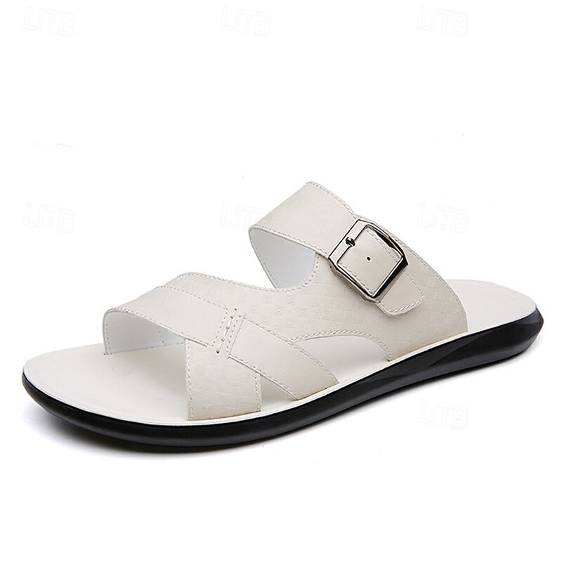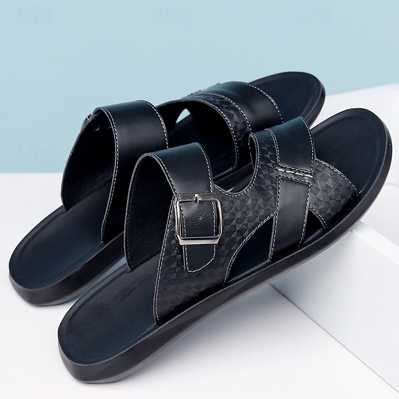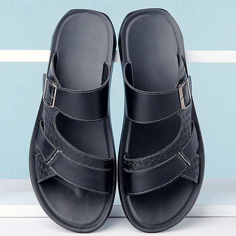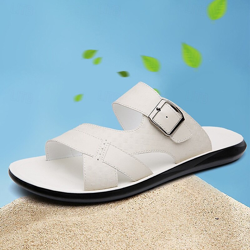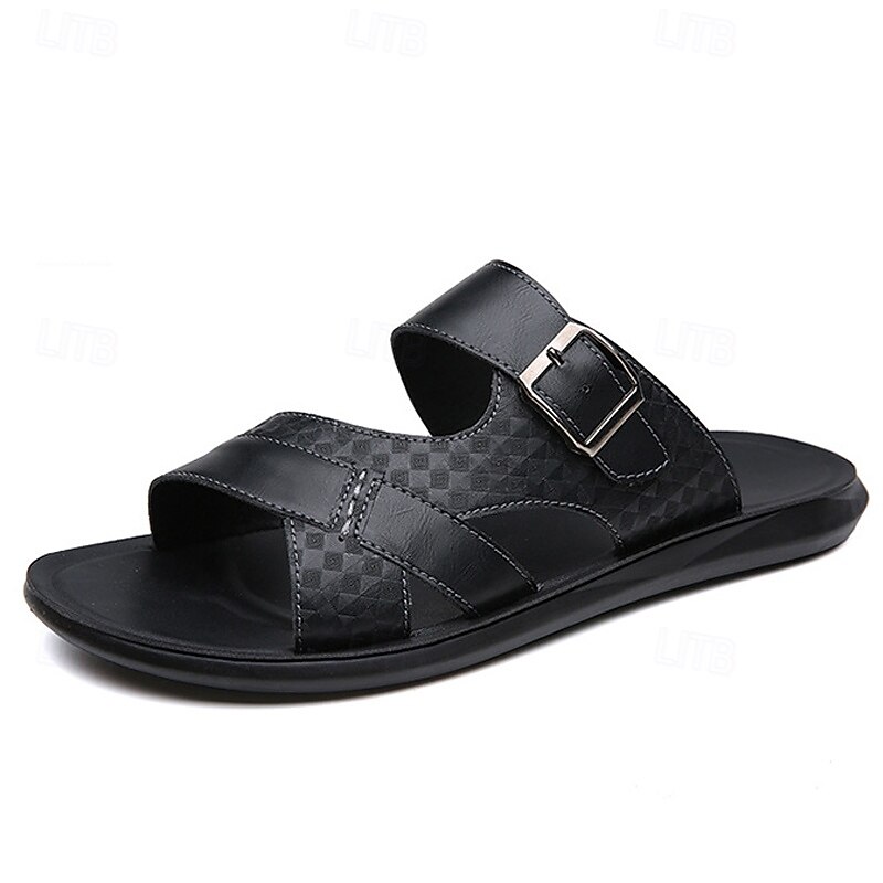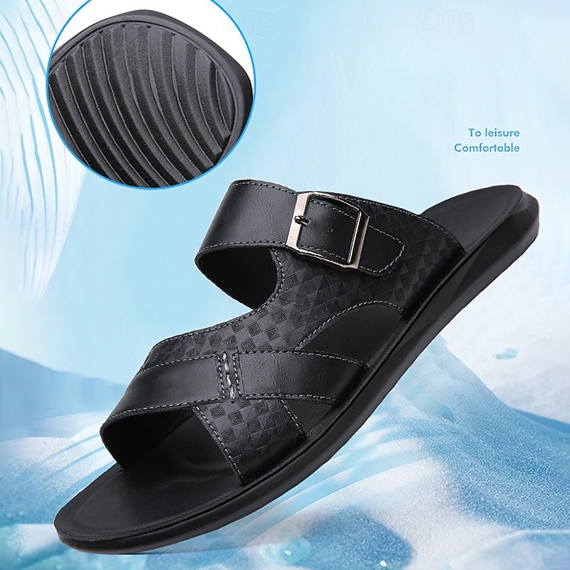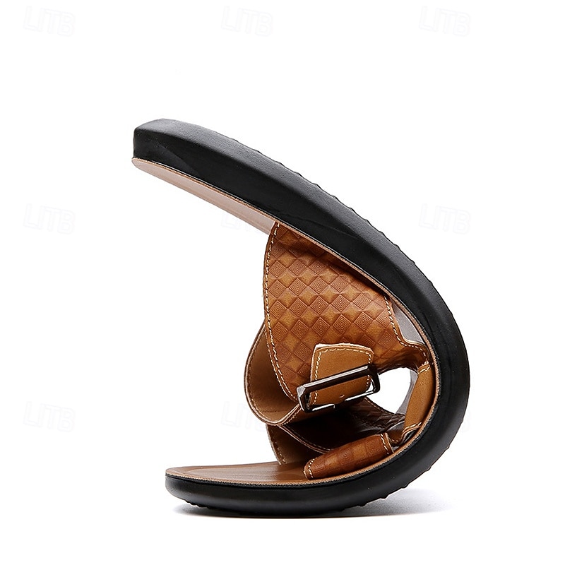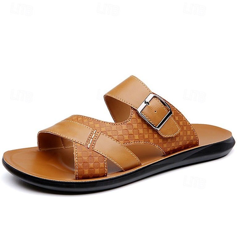 HOT ! Men's Tan Faux Leather Buckle Strap Sandals – Stylish Summer Slides with Textured Design and Non-Slip Sole for Casual Outdoor Wear