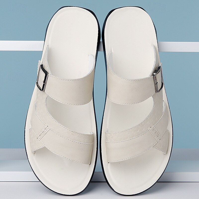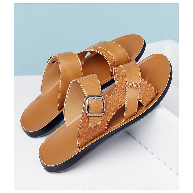 Men's Tan Faux Leather Buckle Strap Sandals – Stylish Summer Slides with Textured Design and Non-Slip Sole for Casual Outdoor Wear 17