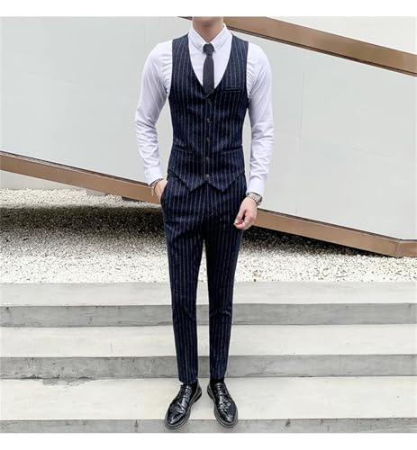 HOT ! Adhdyuud Men's (Jacket+Vest+Pants) Striped Suit Slim Tuxedo Jacket Pants Formal Groom Wedding Dress Suit