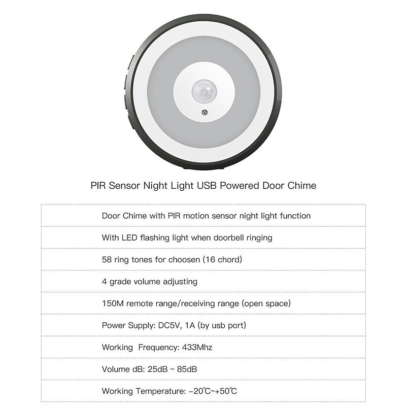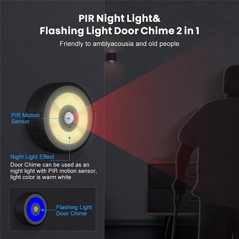 7. PIR Night Light & Flashing Light Door Chime 2-in-1: The door chime flashes a blue light and rings when the doorbell is pressed. It can also function as a night light with motion detection PIR, making it friendly for people with hearing impairments and the elderly.