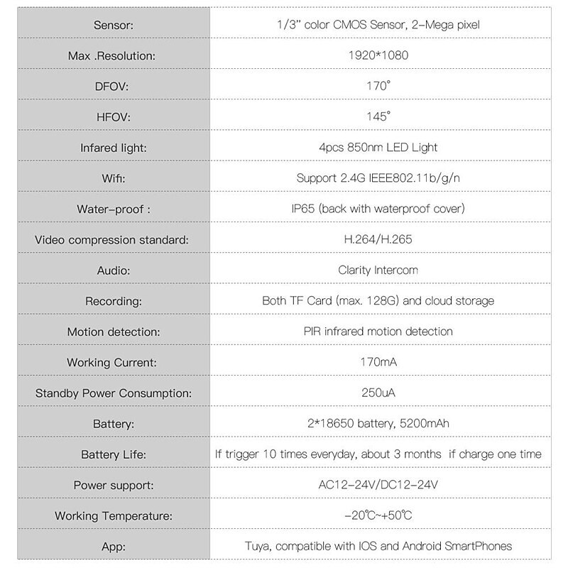9. High-Quality Specifications: Features a 2-Megapixel 1/3'' color CMOS sensor, maximum resolution of 1920*1080, 170° DFOV and 145° HFOV, 4pcs 850nm LED lights, 2.4G IEEE802.11b/g/n Wi-Fi support, IP65 waterpr