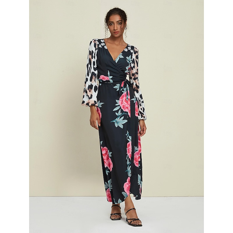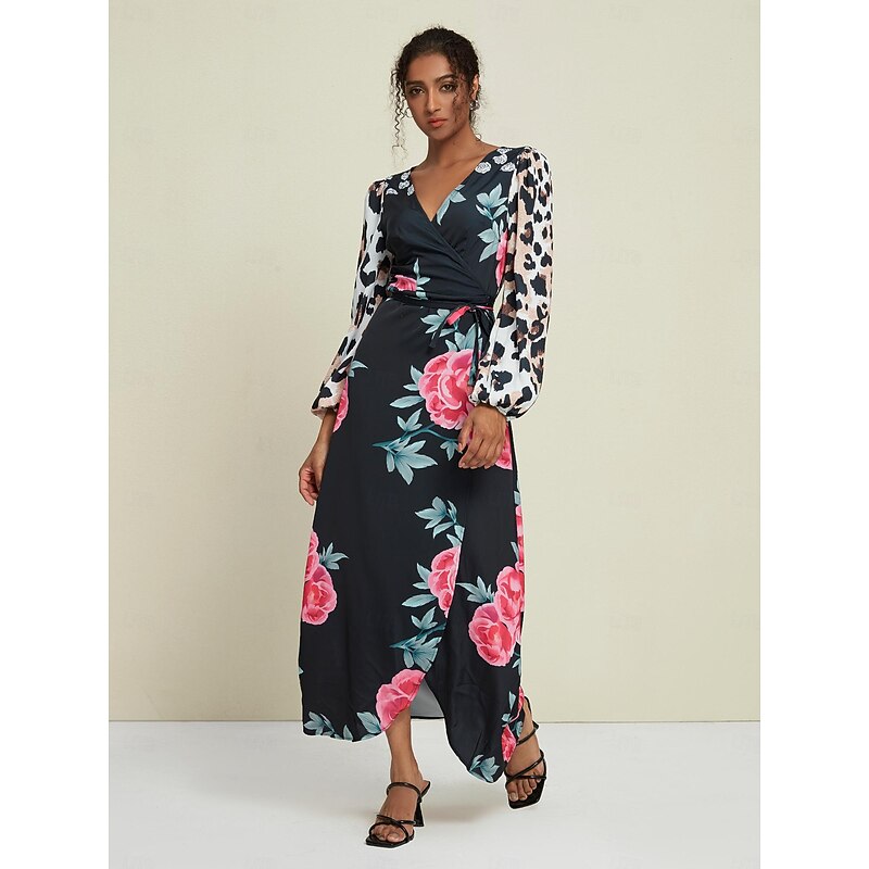 More information about Satin Wedding Guest Floral Leopard Print Long Sleeve V Neck Maxi Dress