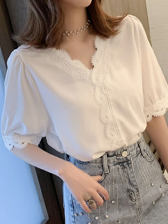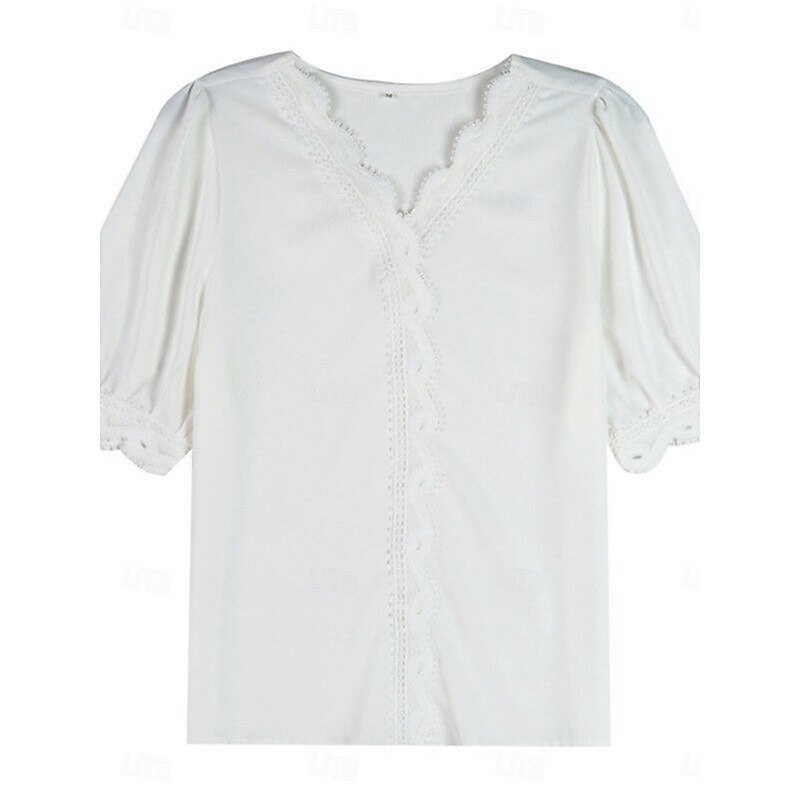 More information about Women's Blouse Solid Color Stylish Basic Casual Short Sleeve Shirt Collar Regular Tops Daily Patchwork Buttons Lace Trim White Summer