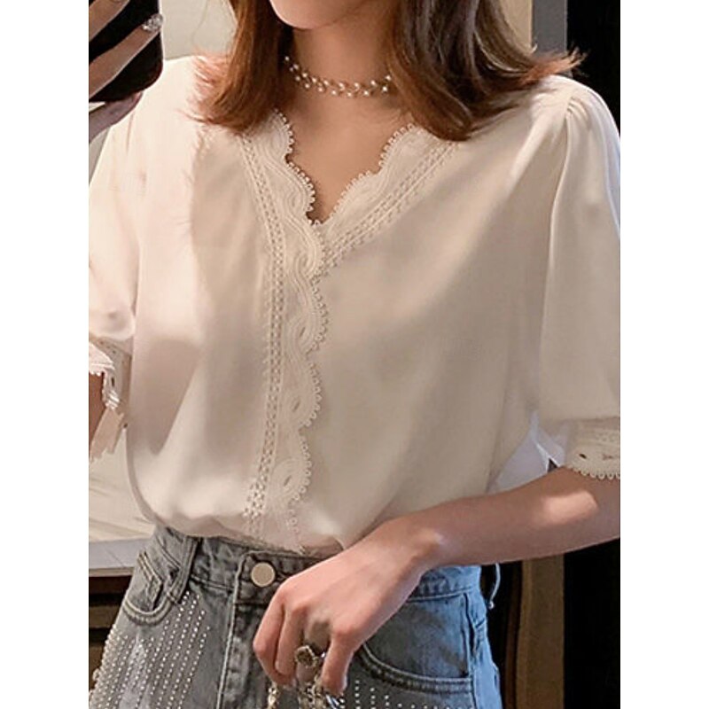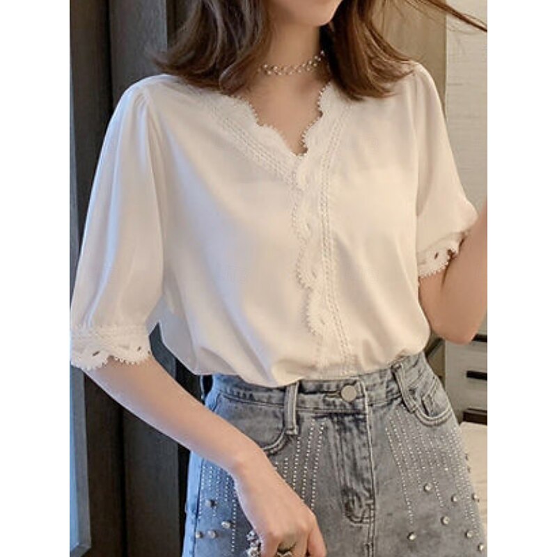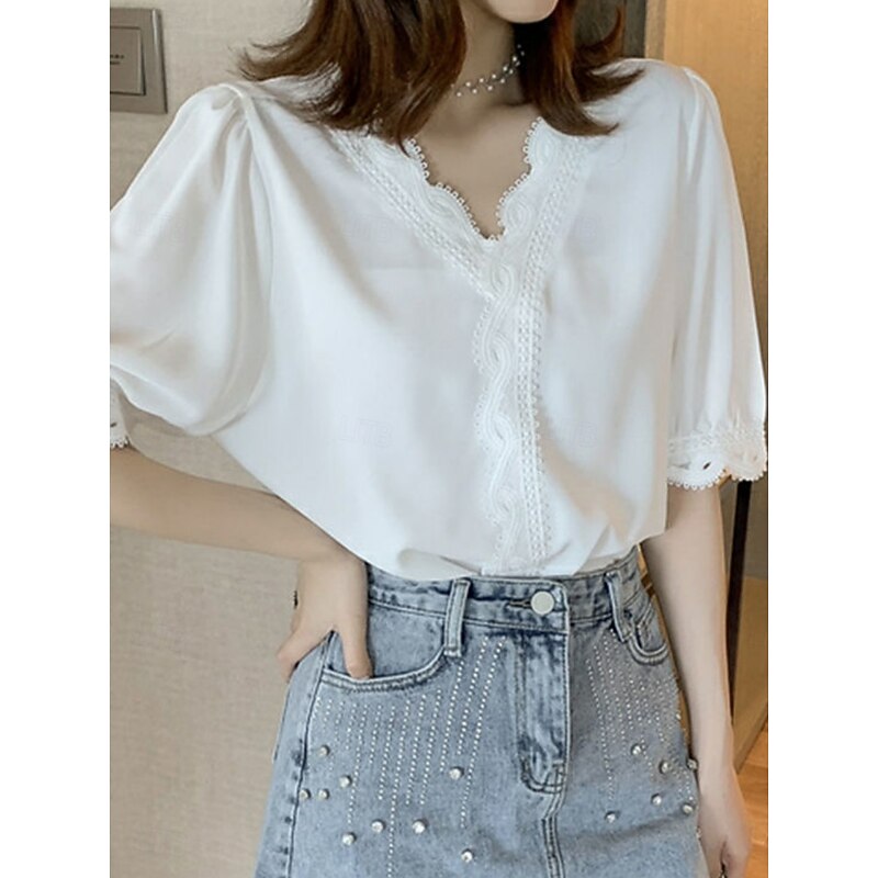 HOT ! Women's Blouse Solid Color Stylish Basic Casual Short Sleeve Shirt Collar Regular Tops Daily Patchwork Buttons Lace Trim White Summer