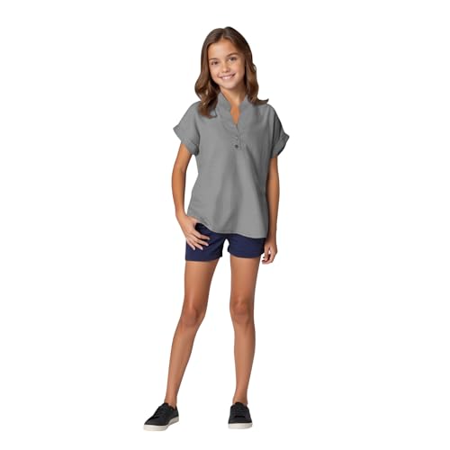 More information about Cotton Linen Shirts for Girls Short Sleeve Kids V Neck Button Dressy T-Shirt Solid Color Loose Trendy Tops Tees 2025