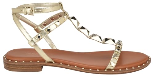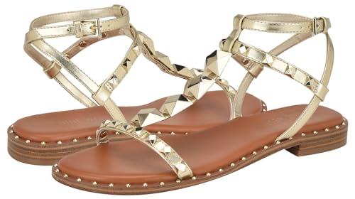 • Make a statement in the Nine West Marcila flat sandals. This sandal features stylish studs, almond shaped toe and an adjustable ankle strap for a secure fit. This flat is anything but boring! Founded in 1978, Nine West empowers women to take on the world in style, from day to night.