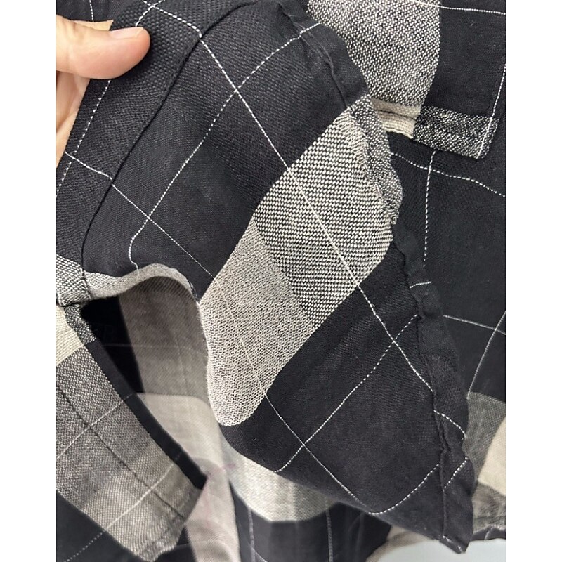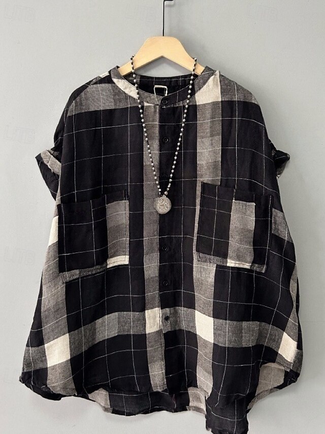 More information about Women's Shirt Linen Shirt Blouse Plaid Modern Casual Long Sleeve Crew Neck Regular Tops Holiday Going out Pocket Buttons Black Fall