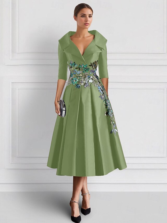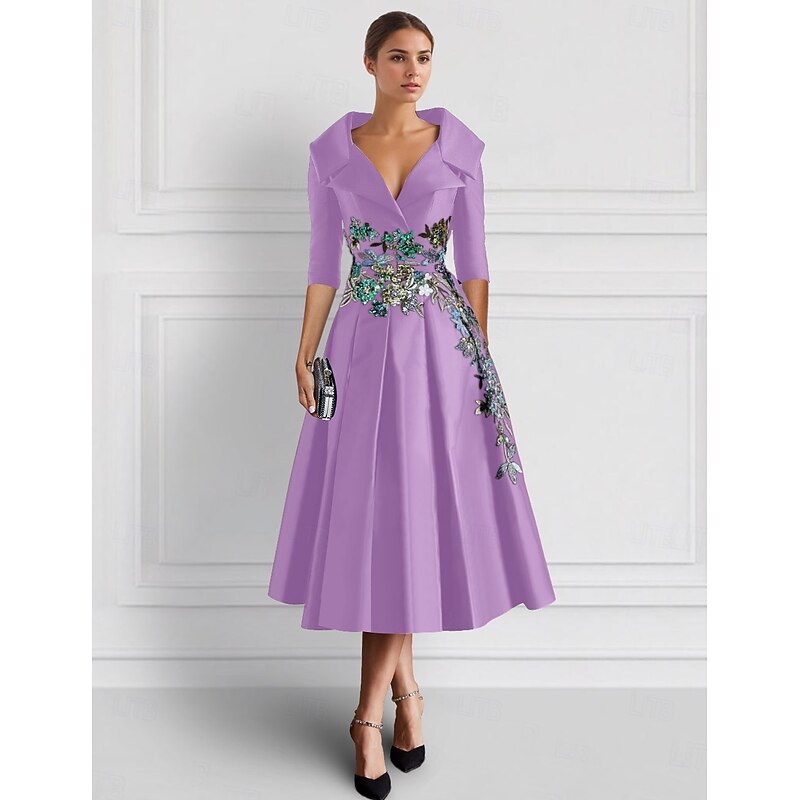 More information about Embroidered A-Line Cocktail Formal Dress Elegant High Split Shirt Collar Ankle Length Satin 3/4 Length Sleeve with