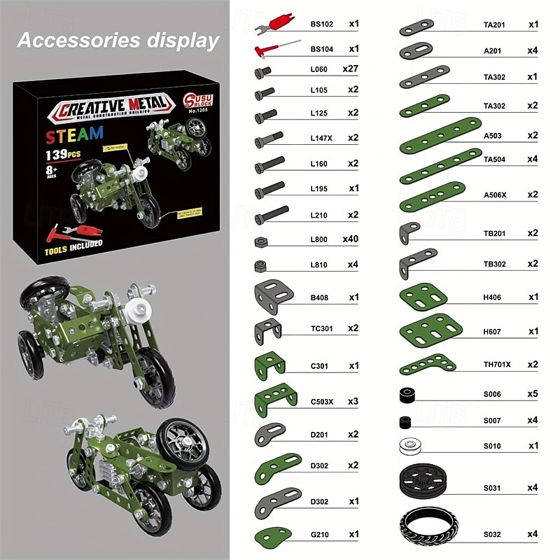 139PCS Metal DIY Tricycle Model Building Kit for Kids  STEM Educational Toy Creative Assembly Motorcycle Blocks for Boys Ages 8-12 Years  Engineering Puzzle Set for Children Ideal Gift 7