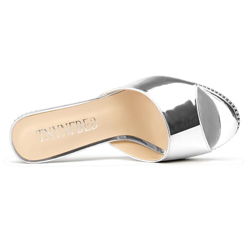 TNYNFBEB Womens Stiletto High Heel Peep Open Toe Sandals Mules Shoes Slingback Slip-on Silver Beaded Prom Party Dress Patent Leather 3.9 Inches Heels 6