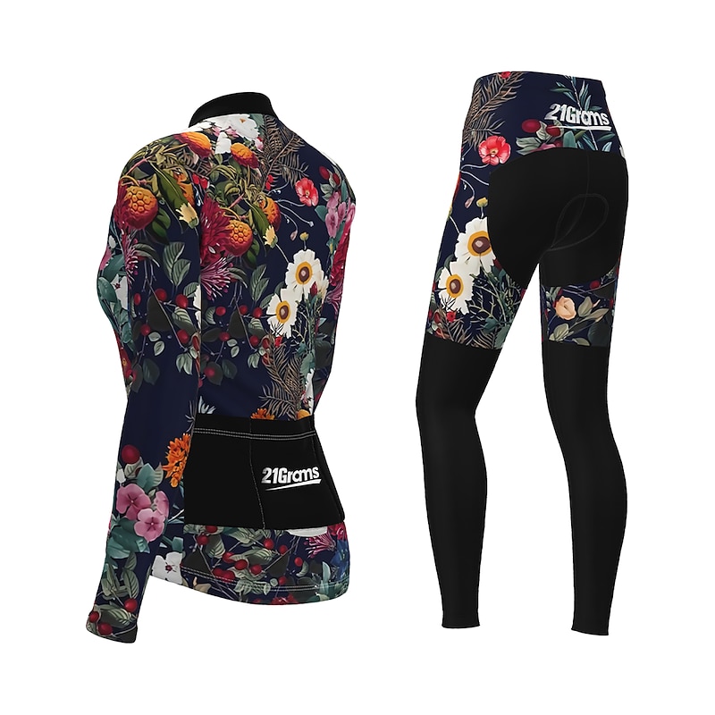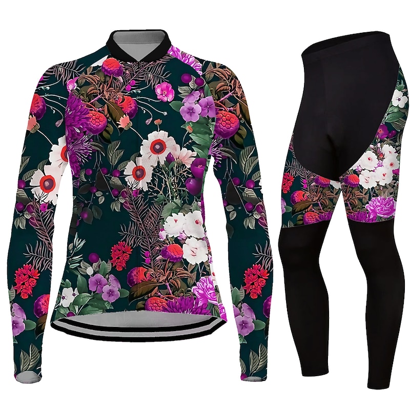 Highlights - The cycling shirts feature 3 back pockets which can store essentials like wallets, maps, and snacks. - Made of high-quality polyester fabric with 80% polyester and 20% spandex, the clothes are breathable, quick-drying, and have a great moisture-wicking function, ensuring maximum comfort during your cycling sessions. - The four-way stretchy crotch with high elasticity provides flexibility and prevents fabric tear. - The anti-slip elastic leg grippers and elastic silicone strap of the jersey keep it compressed and tight, preventing slipping. - The compression fit of the jersey increases mobility and muscle support, while the flatlocked seams add comfort and flexibility during long-distance cycling. - The jersey is equipped with a 3D thickened protection pad with gel and foam padding, providing extra support and protecting your hipbone from injuries. - This product is long-sleeved and designed for women. - It has stretchy elasticity, allowing for a comfortable fit. - Suitable for various occasions, including athletics and leisure activities. - The jersey features quick-dry and thermal warm functions. - It also has ankle zips and a zipper pocket for added convenience. - The pattern of the jersey is graphic, with floral botanical details. - This product is suitable for mountain bike MTB discipline and road bike cycling.