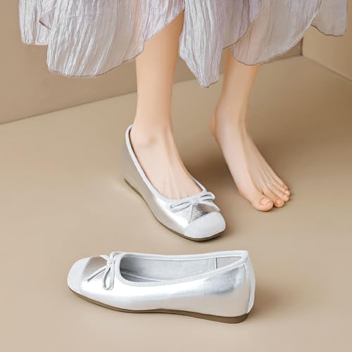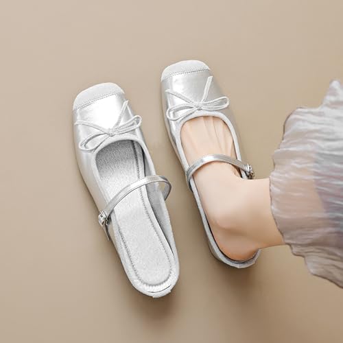 Women's Leather Inner Height Bowknot Slip-On Cap Toe Ballet Flats Closed Square Toe Comfortable Non-Slip Ankle Strap Casual Flat Pumps for Daily Shopping Traveling 5
