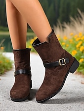 More information about Women's Dark Brown Faux Suede Mid-Calf Boots with Black Buckle Straps, City Nomadic Style Outdoor Riding Boots for Fall Winter Casual Wear