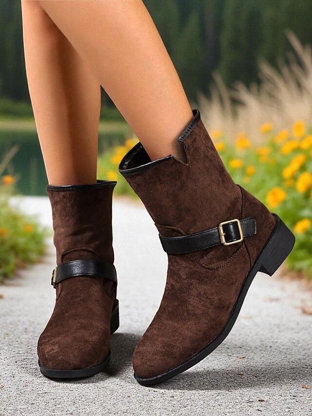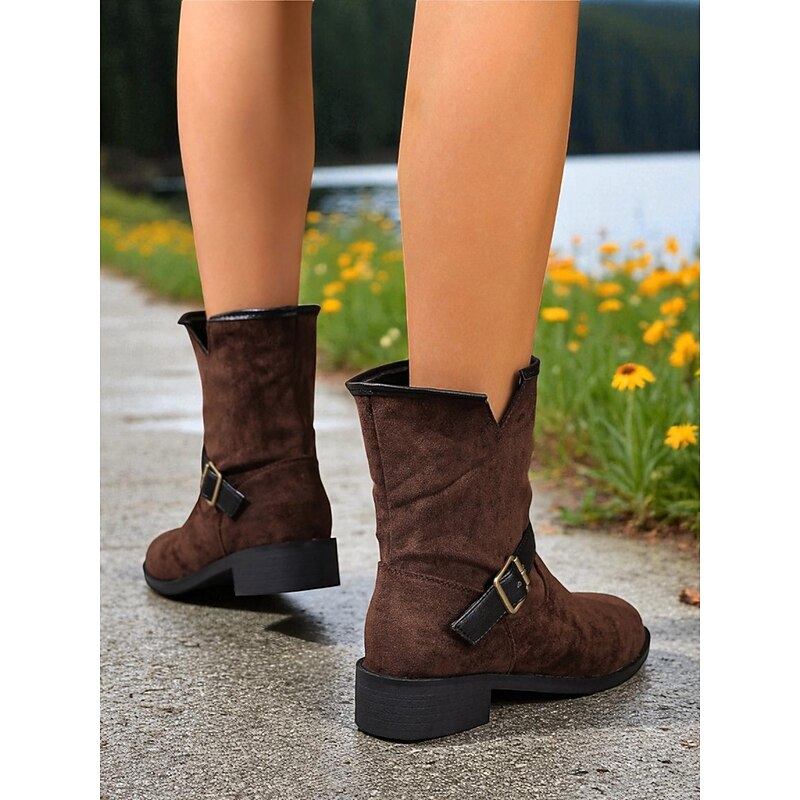Women's Dark Brown Faux Suede Mid-Calf Boots with Black Buckle Straps, City Nomadic Style Outdoor Riding Boots for Fall Winter Casual Wear 1