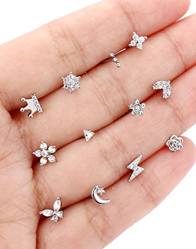 Akeoqi 12Pcs Nose Rings Stud L Shape Nose Rings Cubic Zirconia Butterfly Flower Eye Moon Crown Heart Lightning Shape Nose Studs Piercing Jewelry for Women Men 20G Silver Gold Tone 7