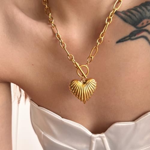 Chunky Gold Heart Necklace for Women,18K Gold Plated Puffy Heart Pendant with Paperclip Chain,Stainless Steel Statement Jewelry Waterproof Jewelry Gift for Chrismas 2