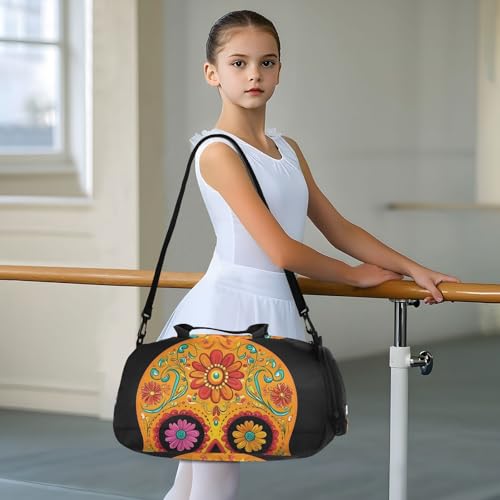 Kids Sports Duffel Bag for Boys & Girls - Sugar Skull Flower Mexican 100% Polyester Gym Bag with Separate Shoe Compartment, Adjustable Shoulder Strap, Compact Travel & Workout Gear Bag 6