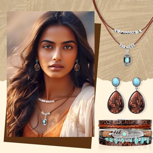 Misdary 3 Pcs Rustic Western Jewelry for Women Cowgirl Jewelry Set Turquoise Necklace Earrings Cuff Bangle Bohemian Bracelet for Women 5