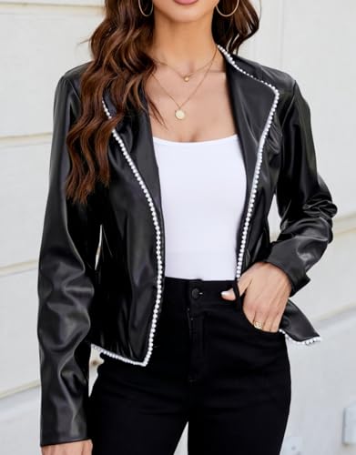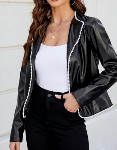 • Feature: long sleeve, open front, pearl trim,lapel collar, solid color, leather crop jacket for women