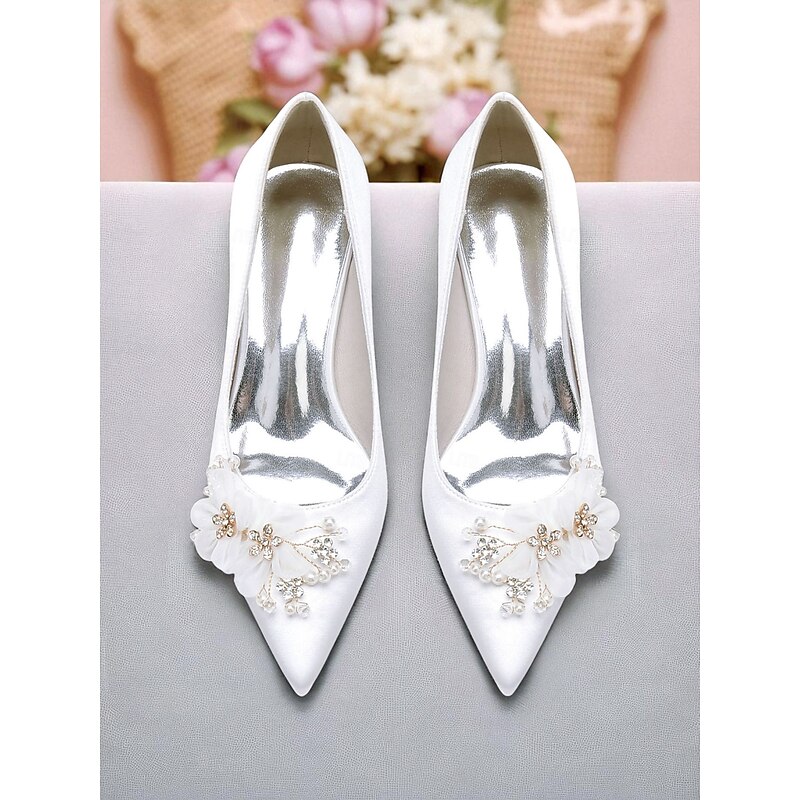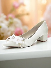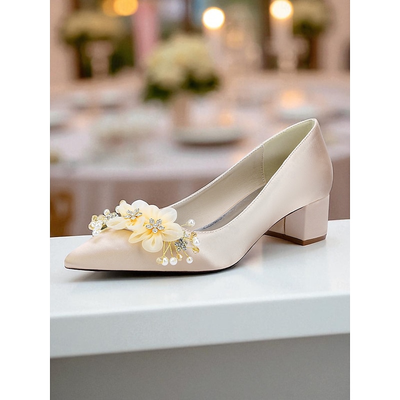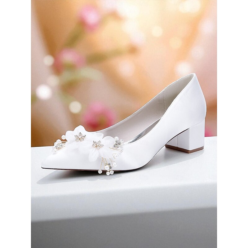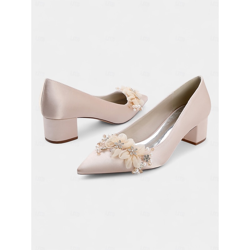 HOT ! Women's Satin Wedding Shoes - Elegant Pointed Toe Block Heel Pumps with Pearl and Floral Embellishments, Comfortable Formal Bridal and Party Footwear