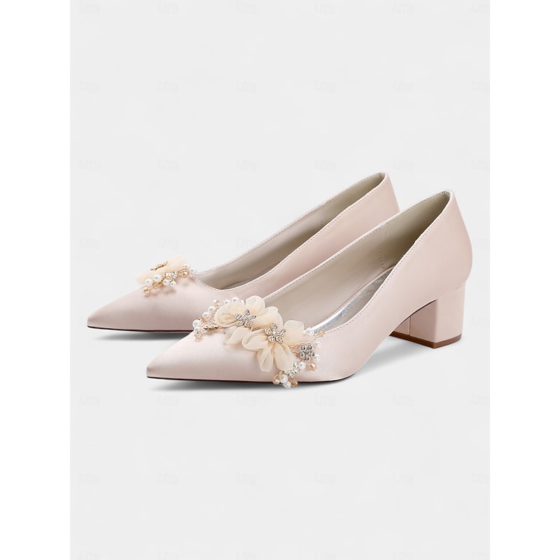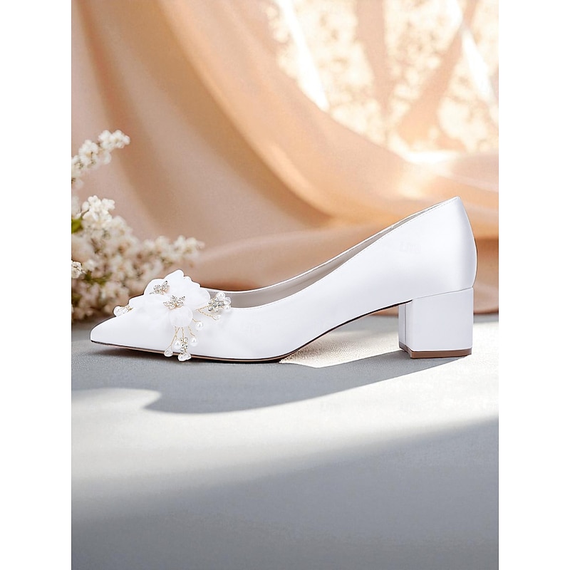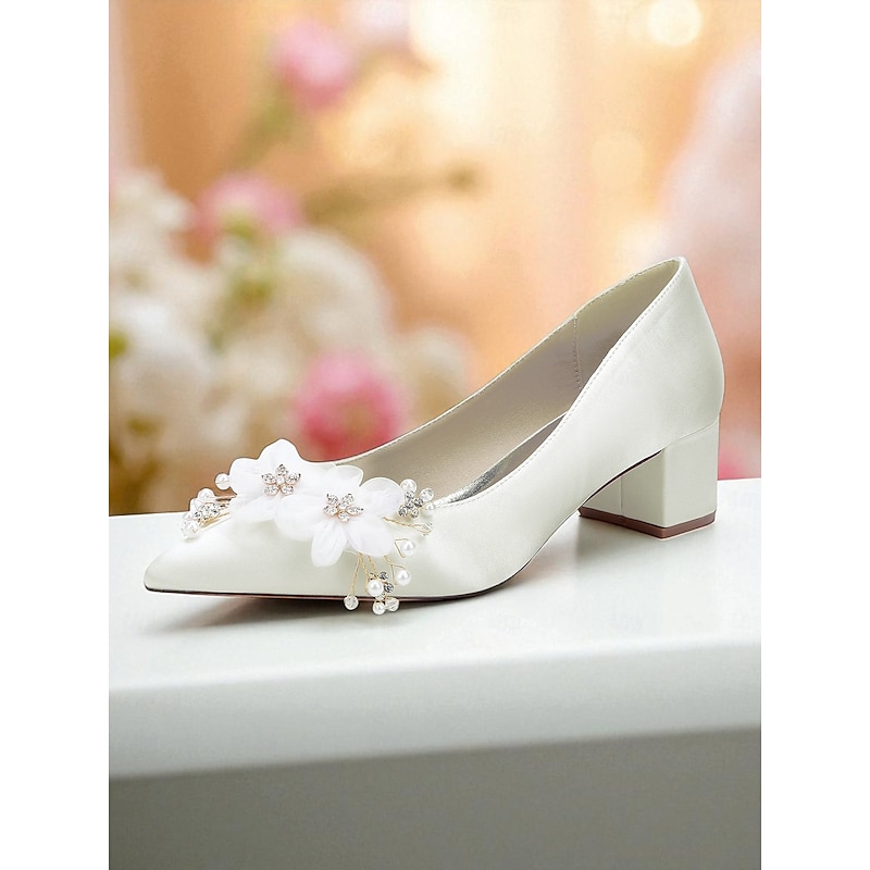 Women's Satin Wedding Shoes - Elegant Pointed Toe Block Heel Pumps with Pearl and Floral Embellishments, Comfortable Formal Bridal and Party Footwear 1