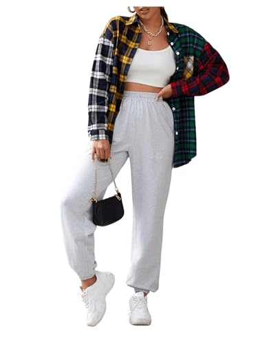 HOT ! Floerns Women's Tartan Color Block Long Sleeve Plaid Button Down Blouse
