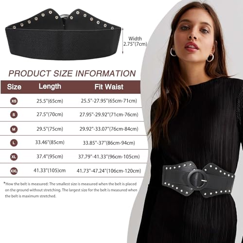 • Self-Covered PU Leather O Ring Buckle: Our women's fashion wide elastic waistband is designed with retro chunky self-covered PU leather pin buckle, convenient to put on and take off. Its classic style makes you look more elegant and stylish. The simple big buckle is an eye-catching embellishment for the whole belt