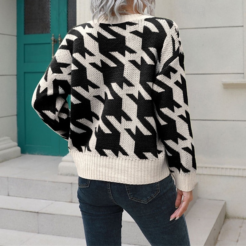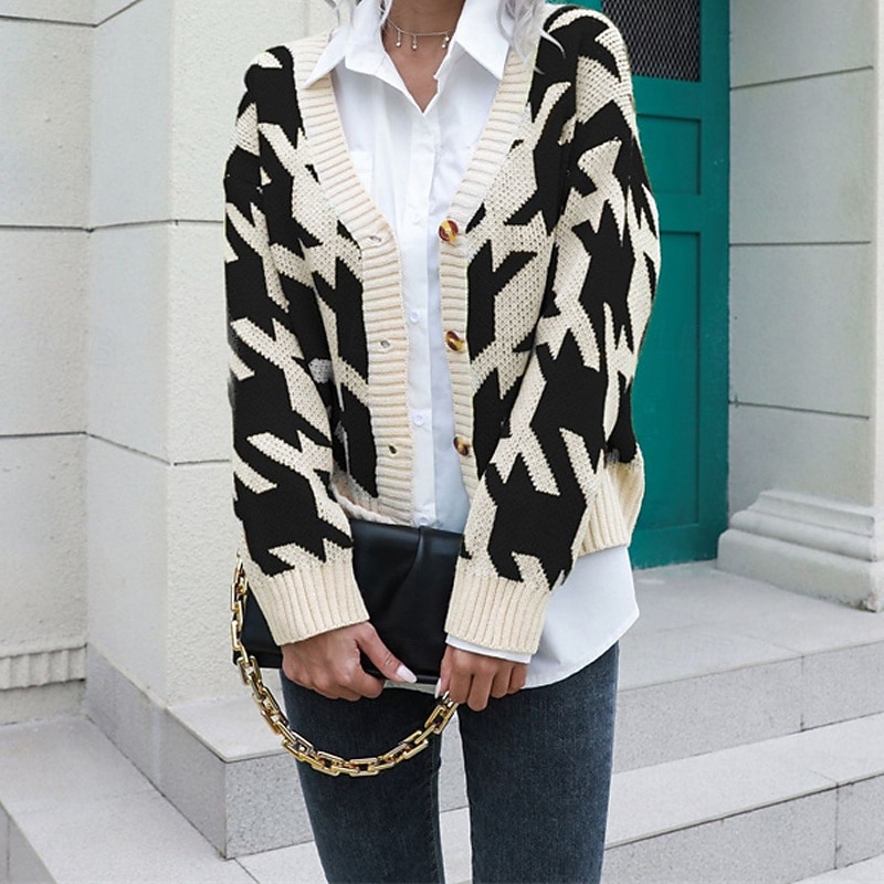 Highlights - Stay cozy and stylish in this Fall/Winter season - Long sleeves for extra warmth - Designed for women with a casual style - Perfect for daily wear - Cardigan sweater for easy layering - Regular fit for optimal comfort - Trendy houndstooth pattern - Turtleneck for a chic look - Chunky knit adds texture and dimension to your outfit