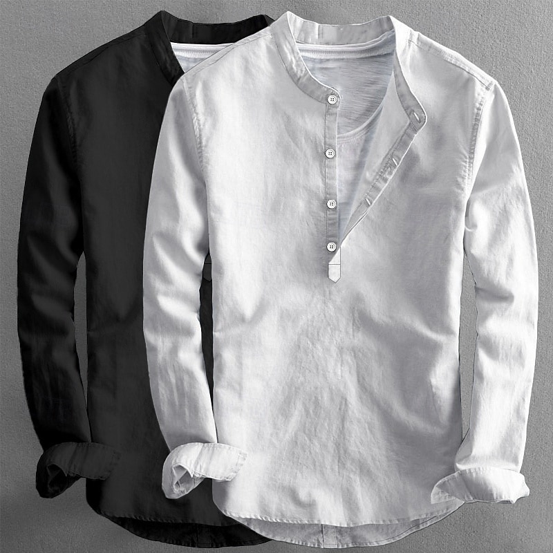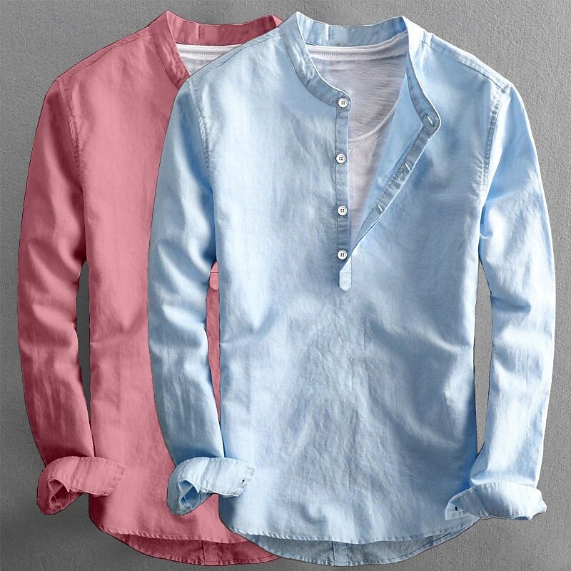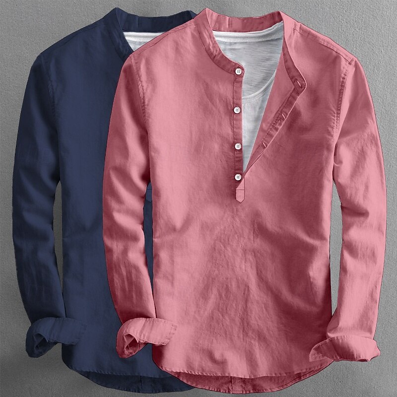 More information about Men's Linen Shirt Popover Shirt Summer Shirt Beach Wear Casual Shirt Band Collar Shirt Plain Vacation Casual Orange+blue Pink+Navy Blue White+Black Pink+Blue Long Sleeve Collar Summer Spring Clothing