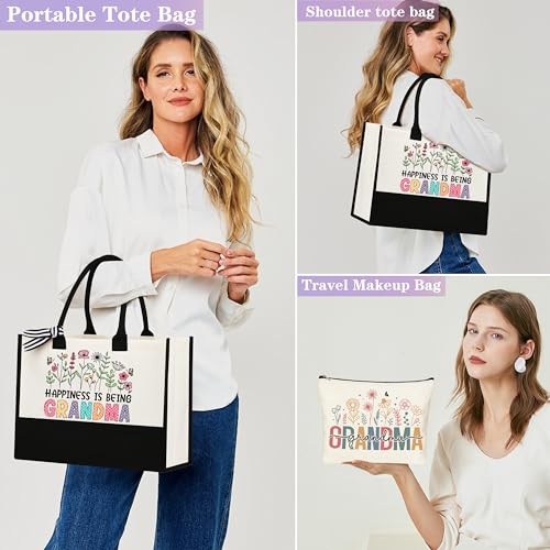 • Tote Bag for Grandma: Our grandma tote bag and makeup bag are made of high-quality canvas for durability and a soft touch. With precision double-thread stitching, they are strong enough to carry many items without tearing. The tote bag (15.7"x 11.6" x 5.8") and makeup bag (8.2" x 5.9"x 3") are spacious enough to hold clothes, toiletries, and everyday essentials