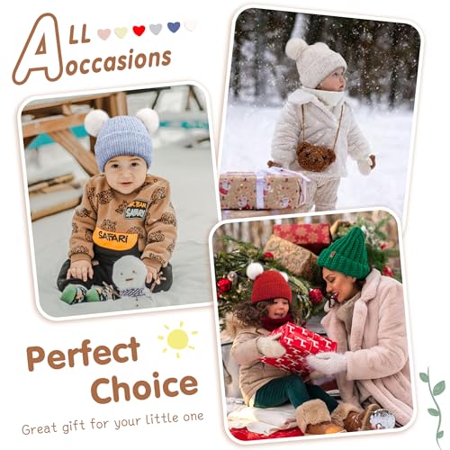 • Cute & Stylish: The feature of this baby beanie is an interesting mixed-color design, creating a vibrant color combination like a rainbow. Pair the toddler hats with cute boots or winter clothes to add cuteness and fashion to your child! From the playful red beanie, pink and blue to the versatile grey and white. Plus, the adorable double pom poms for hats add charm! Wearing it on your child's head is sure to win the worship of other children!