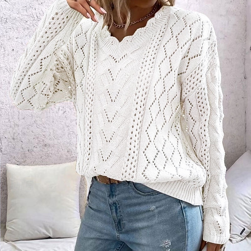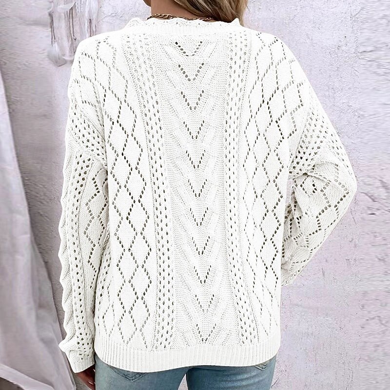 Highlights [Fabric] Crafted from a high-quality polyester fabric, this women's sweater offers micro-elasticity for ease of movement and comfort. The cozy material ensures warmth during the fall and winter months, making it a go-to piece for various seasonal activities. [Fit] The sweater boasts a loose fit with a relaxed silhouette, perfect for layering over other garments. The ribbed cuffs and hemline provide subtle detailing while ensuring a snug, flattering fit that caters to a wide range of body types. [Design Highlights] Featuring a distinctive V-neck and crochet knit style, this sweater combines classic design with modern elements. The geometric pattern adds a touch of visual interest, making it a trendy and stylish addition to any wardrobe. [Occasions] Ideal for daily wear, outdoor activities, and weekend outings, this versatile sweater is designed for casual elegance. Its neutral white and khaki colors make it easy to pair with jeans for a laid-back look or with accessories for a more polished ensemble. [Size Range] Available in a comprehensive size range including S, M, L, and XL, this sweater provides an option for different body shapes and preferences, ensuring a comfortable and tailored fit for everyone.