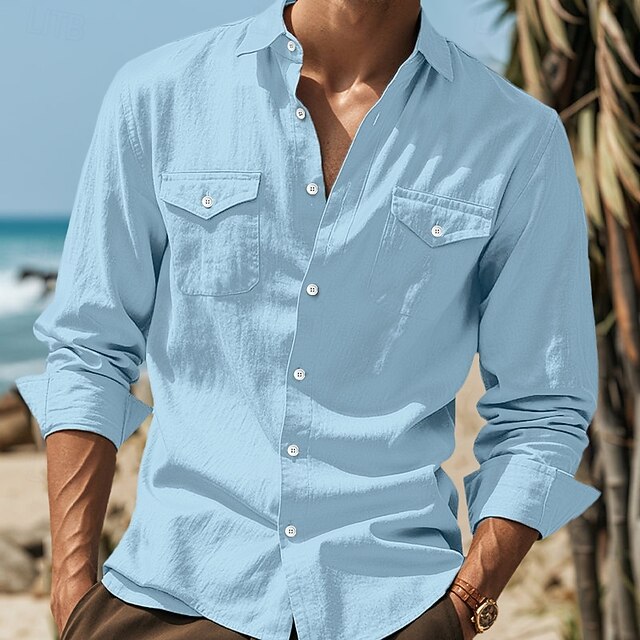 More information about Men's Shirt Linen Shirt Summer Shirt Beach Wear Button Up Shirt Untucked Shirts Solid Color Vacation Street White Blue Green Khaki Long Sleeve Collar Clothing Apparel Pocket