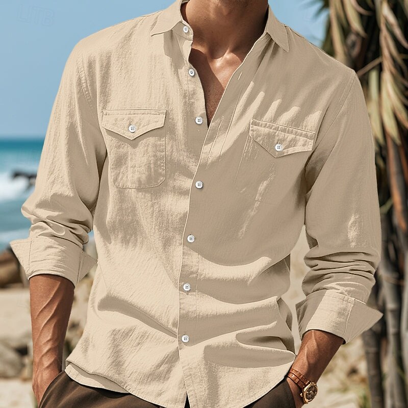 HOT ! Men's Shirt Linen Shirt Summer Shirt Beach Wear Button Up Shirt Untucked Shirts Solid Color Vacation Street White Blue Green Khaki Long Sleeve Collar Clothing Apparel Pocket