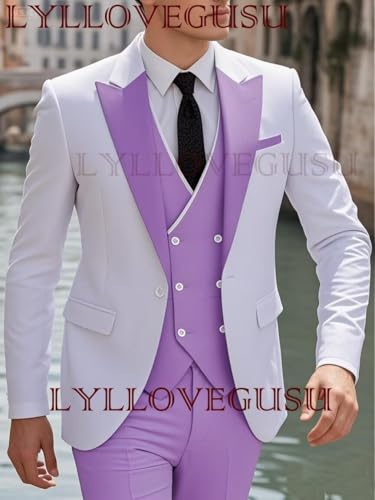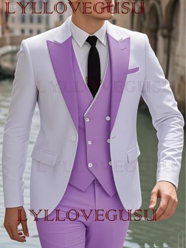 • FEATURES @ Lilac Men's White and Lilac Suits: This fashion modern mens 3-piece suit blazer vest pants sets with Peak lapel blazer, one button blazer, white buttons double brested vest,jacket back double vents,and "Any Size"Choose can be custom color or size for you.