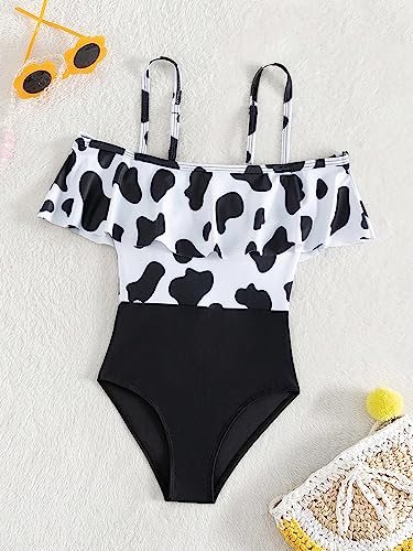 WDIRARA Girl's Cute Cow Print Swimwear Ruffle Trim Cold Shoulder Boho One Piece Swimsuit 1