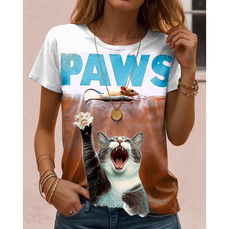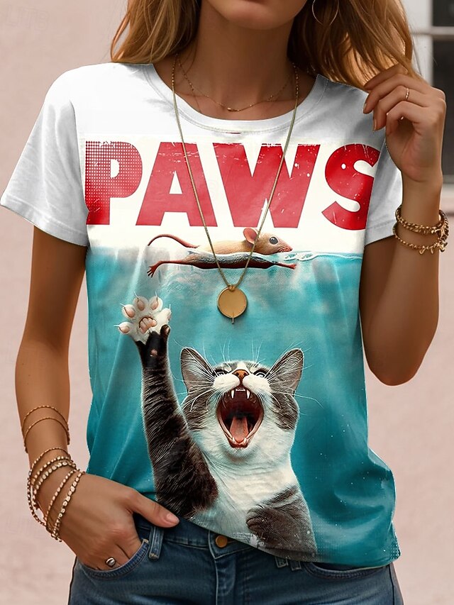 More information about Women's T Shirt Graphic Cat Letter Vintage Stylish Classic Short Sleeve Crew Neck Regular Tops Daily Weekend Print Blue Purple Green Khaki Summer Spring