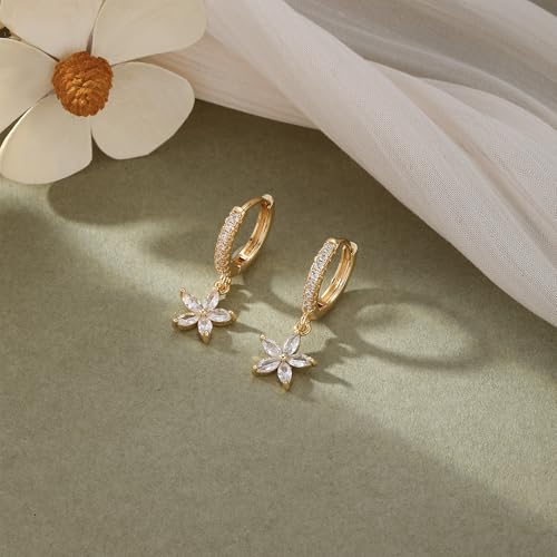 • ✨ Charming Floral Motif:our dangle earrings is Delicate floral-shaped cubic zirconia stones dangle from a sleek gold-plated hoop, creating a feminine and romantic aesthetic perfect for any jewelry lover.