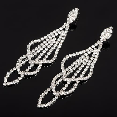 HOT ! Silver Rhinestone Rectangle Dangle Earrings for Women Cubic Zirconia Crystal Dangle Earrings Long Chandelier Earrings Multi Layer Tassel Earrings Wedding Bridal Jewelry