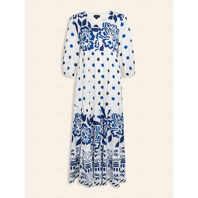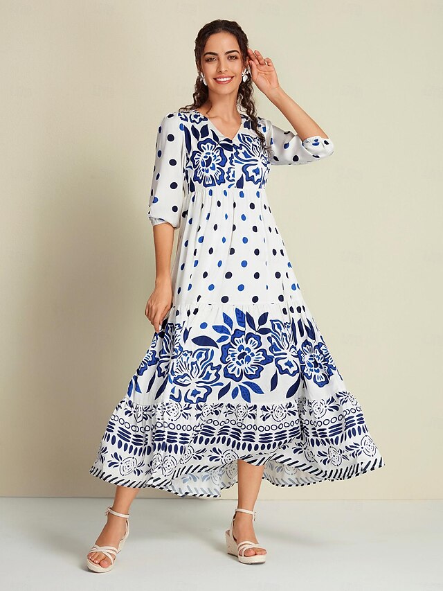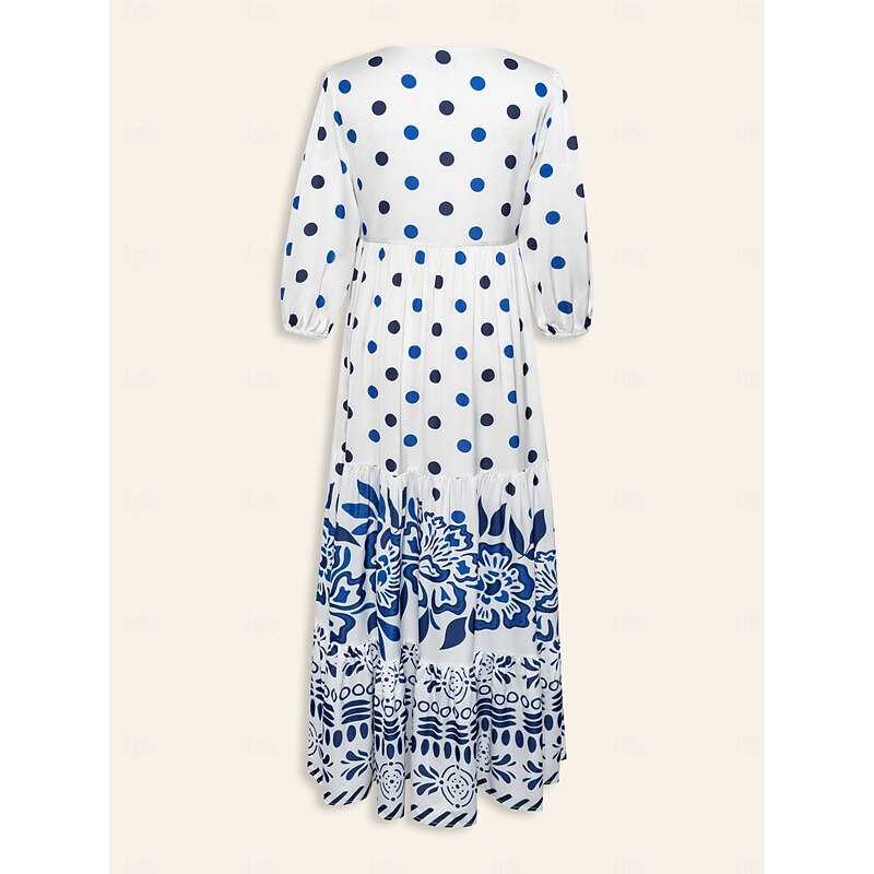 Satin Polka Dot 3/4 Length Sleeve V Neck Maxi Dress 1