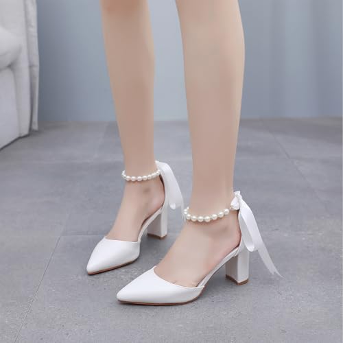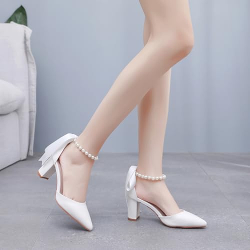 HOT ! Bridal Shoes for Women White Pearl Heels Leather Closed Toe Pumps 3 Inch Chunky Heel Wedding Shoes for Bridal Heels Wedding Party Evening Casual Wear