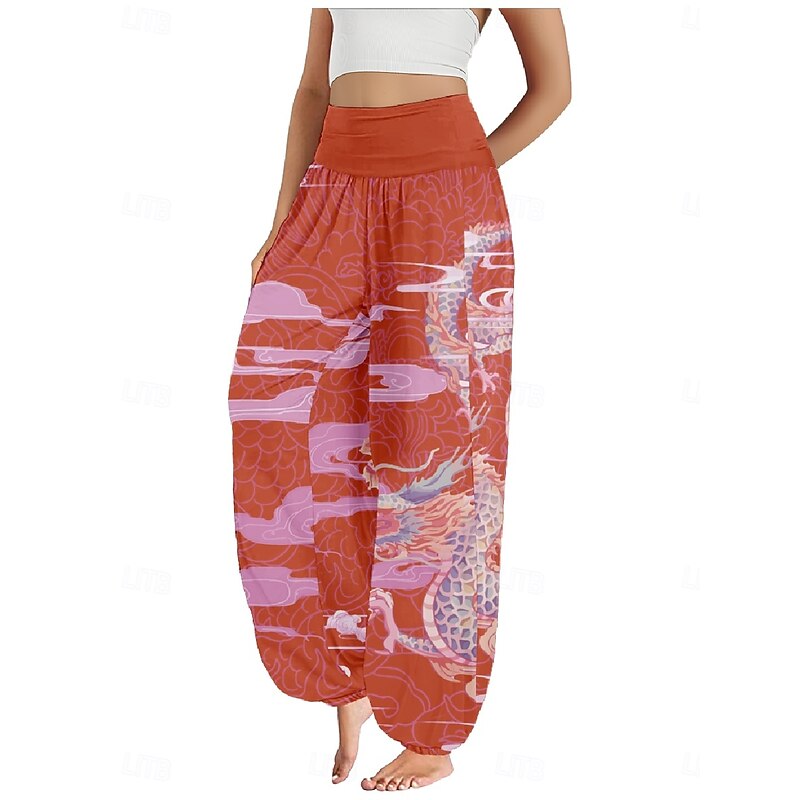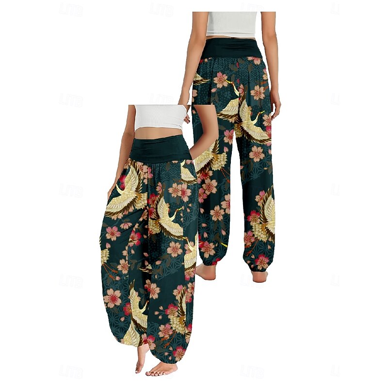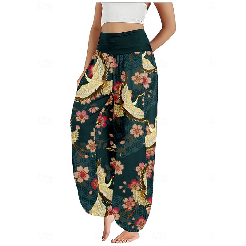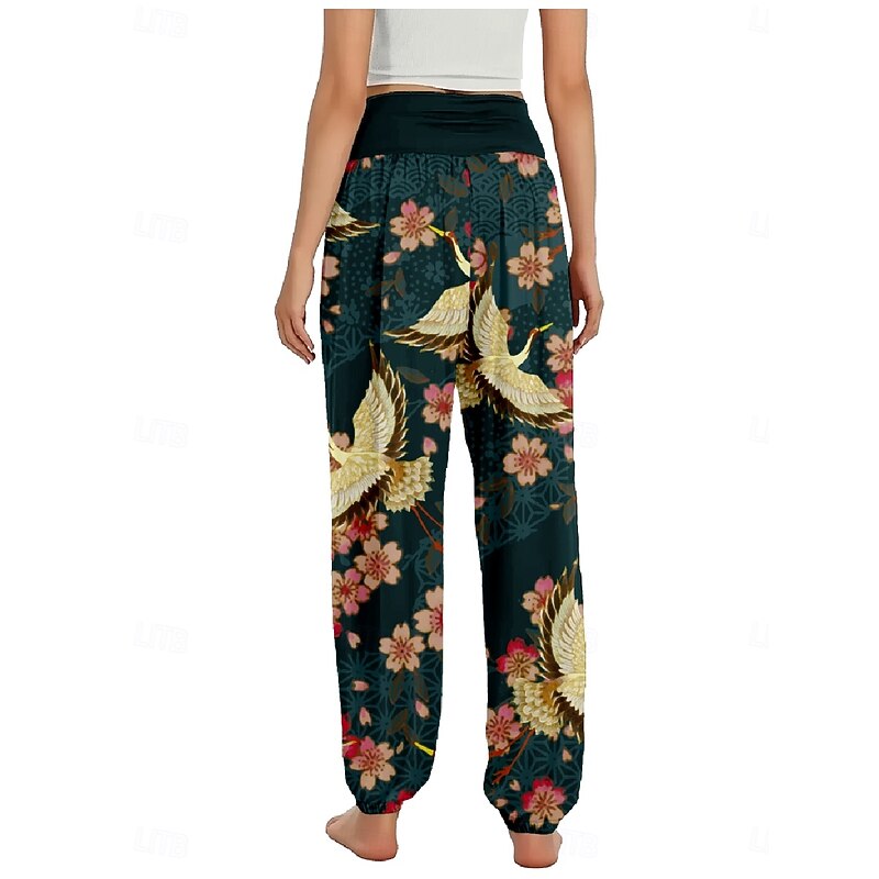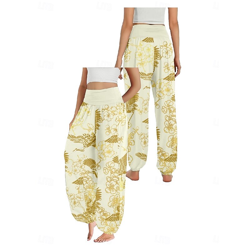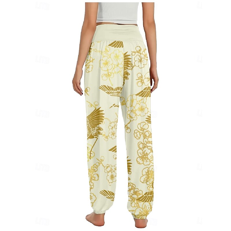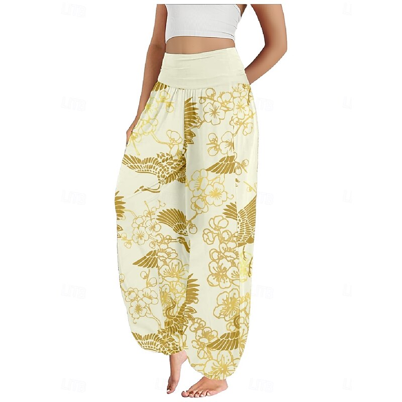 Women's Linen-Inspired Pants Wide Leg Pants Trousers Ethnic Style Casual Boho Full Length High Waist Floral Pocket Elastic Waist Printing Breathability Soft Micro-elastic Outdoor Yoga Black Yellow 9