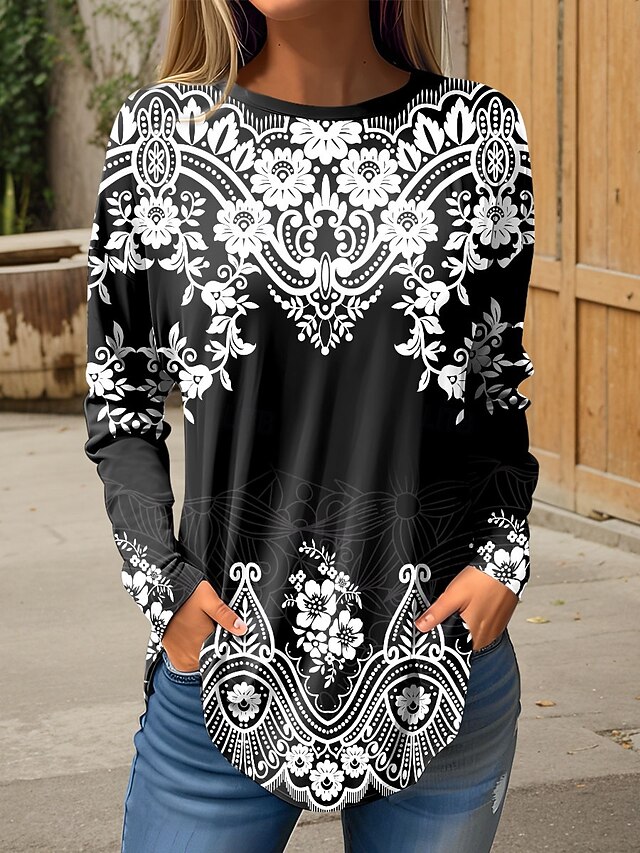 Women's T Shirt Graphic Tribal Vintage Fashion Stylish Long Sleeve Crew Neck Round Neck Regular Tops Weekend Print White Pink Blue Green Spring Fall 2