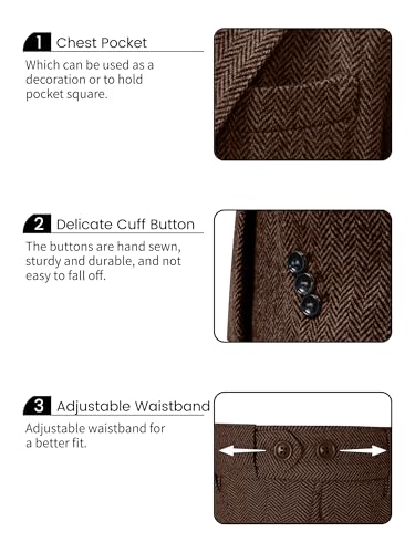 Fabric type: Herringbone Tweed Suit Men: 70% Polyester, 20% Rayon and 10% WoolCare instructions: Dry Clean OnlyOrigin: Imported2 PIECE SUIT SET -- The mens formal suits includes a herringbone tweed blazer/suit jacket and a herringbone tweed suit pants.SUPERIOR MATERIAL -- The herringbone tweed men's suit is the tweed mix with the traditional sawtooth line pattern which give the suit an classic and sophisticated look.FEATURES -- JACKET: Notch lapel, two button closure, real chest pocket, two patch pockets, inner pockets, both side vents, full lining. PANTS: Flat front, front slash back welt pockets, adjustable waist, 2 back button pockets.OCCASIONS -- Men herringbone tweed suit set is great with dress shirts for wedding, groom/groomsmen, business, prom, homecoming, meeting, dinner, and so on. Also a good choice for some less formal activities, like party, graduation, date, banquet, easter, christmas outfits etc. From formal to informal, suitable for various occasions.HOW TO CHOOSE SIZE - IMPORTANT: Please make sure the size of the suit set you choose must be larger than your actual body size. And please only look at our suit size measurements chart in image. Perfect for everyday use. first-class materials and excellent craftsmanship ensure long-lasting durability.