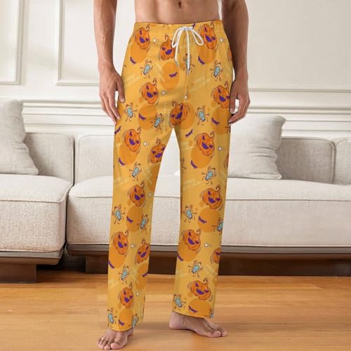 HOT ! Happy Halloween Pumpkin Yellow Mens Pajama Pants Wide Leg Sleep Drawstring Sleepwear Casual Loungewear