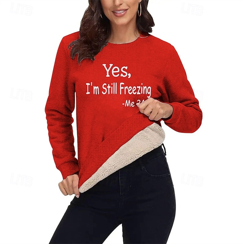 Highlights - Stay warm and cozy in this women's fleece lined polyester sweater - Features a stylish letter print design - Perfect for the winter season - Designed with a comfortable crew neck neckline - A must-have for any woman's winter wardrobe