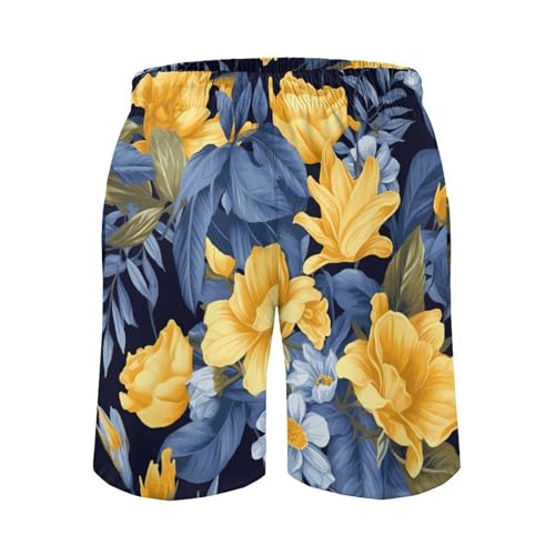 HOT ! Men's Blue Base Yellow Floral Swim Trunks, Quick-Dry Beach Shorts, Bathing Suit with Mesh Lining and Pocket