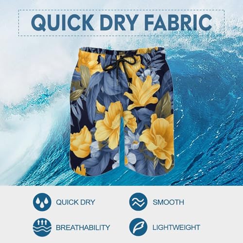 More information about Men's Blue Base Yellow Floral Swim Trunks, Quick-Dry Beach Shorts, Bathing Suit with Mesh Lining and Pocket