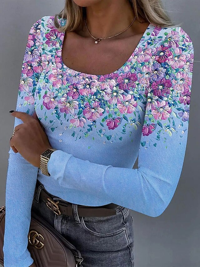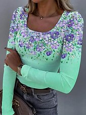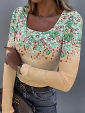 More information about Women's T Shirt Ribbed Graphic Square Neck Long Sleeve Casual Tunic Floral Plants Vintage Stylish Regular Tops Daily Print Pink Blue Orange Green Summer Spring Fall